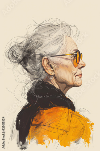 Sketch of an elderly woman in profile wearing glasses, line drawing with vibrant colors