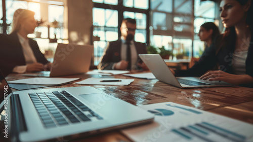 Business people discussing strategy in a modern office with tablets and laptops on the table during a collaborative meeting