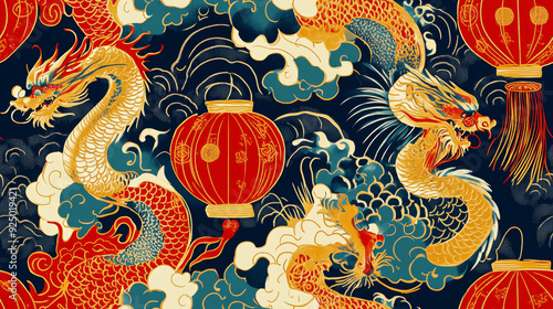 Seamless pattern of intricate oriental dragon and lantern design with rich colors
