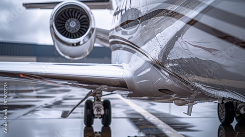 Close-up of private jet engine and fuselage on rainy airport tarmac