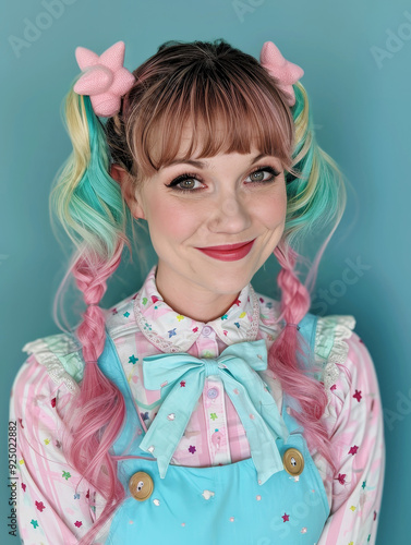 Cheerful woman in her 30s wearing a kawaii outfit with colorful pigtails and a playful expression in a bright setting