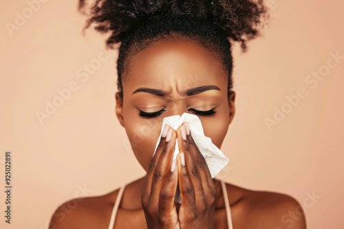 Young African American woman with flu blowing her nose