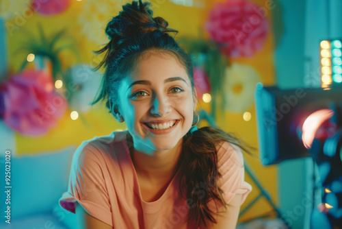 Joyful young woman surrounded by colorful confetti and bokeh lights