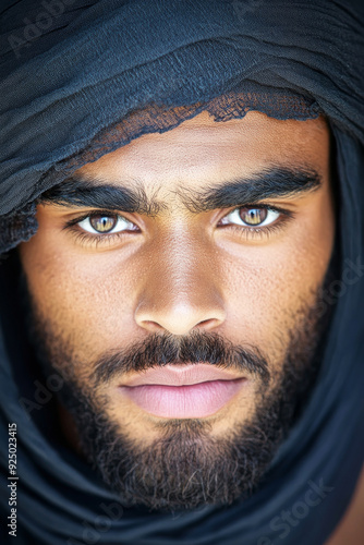Studio portrait of a young Middle Eastern man with dark skin, intense gaze, and black headscarf, reflecting beauty and strength