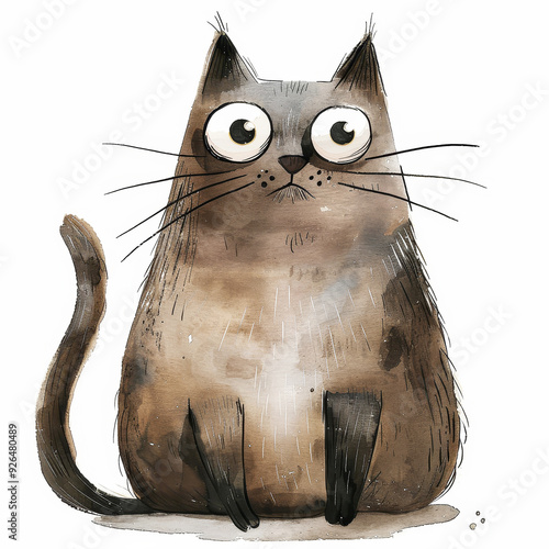 Minimalist funny cartoonish cat in watercolor style isolated on white background