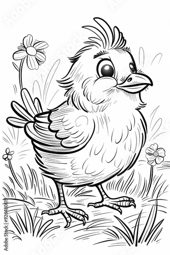 Cute cartoon bird coloring page for kids with flower in the background