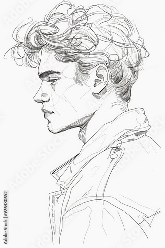 Line drawing sketch of a senior boy's face with thoughtful expression, front view