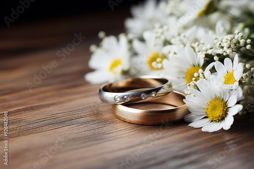 Silver wedding rings with daisy flowers on a wooden surface and copy space