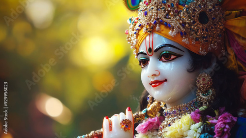 Beautiful depiction of Lord Krishna with vibrant decorations and serene expression