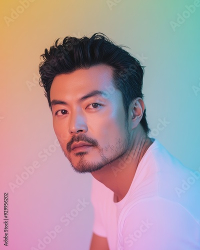 Portrait of a handsome Asian man in his 40s with colorful lighting