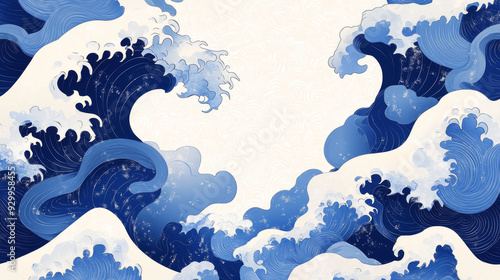 Elegant Japanese wave pattern with blue hues and white accents, ideal for decorative backgrounds