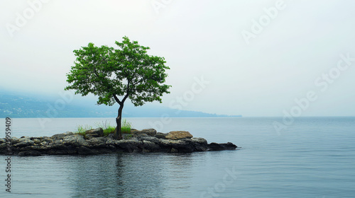 Solitary tree standing atop a hill in foggy minimalistic landscape