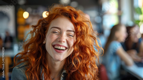 Young red-headed businesswoman laughing in a casual office setting, exuding joy and positivity