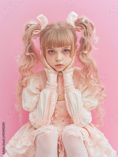 Adorable child with kawaii outfit sitting against pink background, wearing lace dress and pigtails for cute and charming look