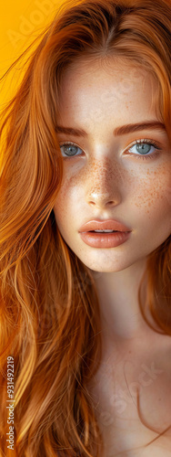 Extreme close-up portrait of a beautiful young woman with red hair and radiant blue eyes