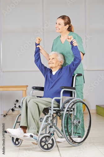 Krankenpflegerin schiebt alte Frau im Rollstuhl