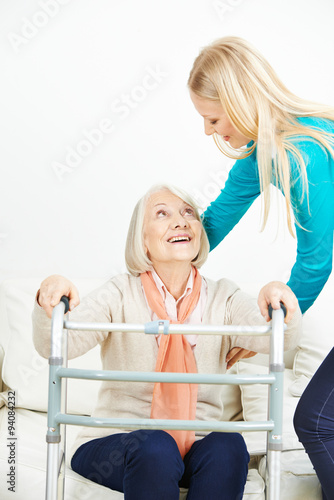 Pflegehilfe hilft Seniorin beim Aufstehen