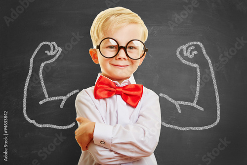 Kind mit Muskeln vor Tafel in Schule