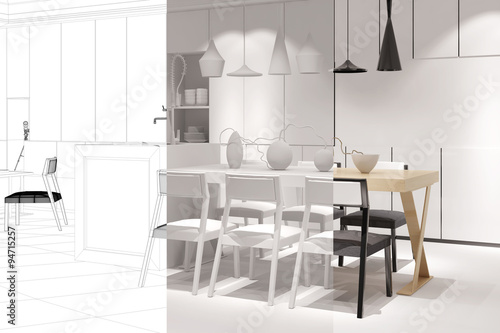 Wohnküche mit Kamin und Sofa im modernen Loft