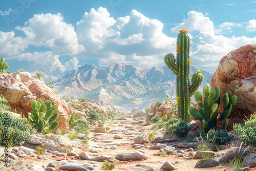 3D render of a scenic rocky canyon with cacti under a bright blue sky