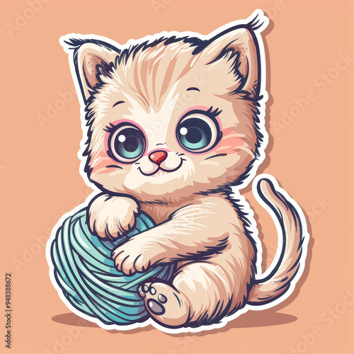 Cute hand-drawn kitten sticker with big eyes hugging a yarn ball