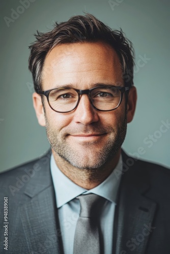 Confident mature Caucasian businessman in his 50s with short gray hair wearing a suit and tie against a neutral background