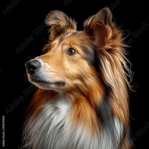 Portrait of a Shetland Sheepdog against a black studio background