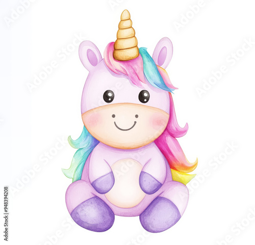 Adorable unicorn with colorful mane sitting surrounded by stars