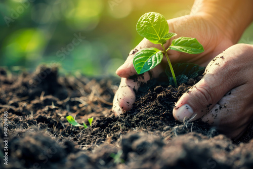 Hands nurturing young plant in soil, concept of growth and care