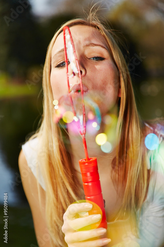 Fröhlicher Junge macht zerbrechliche Seifenblasen