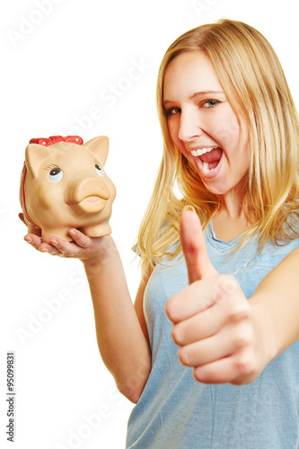 Jubelnde Frau mit Sparschwein hält Daumen hoch