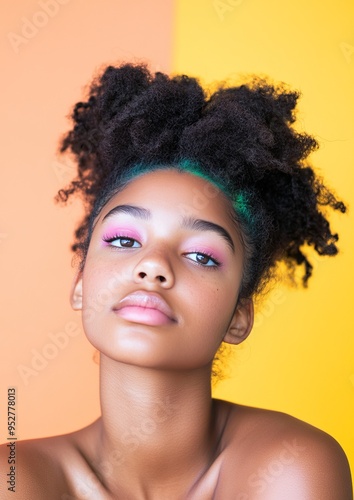 Beautiful Afro-Latina teen showcasing natural skincare beauty on pastel background