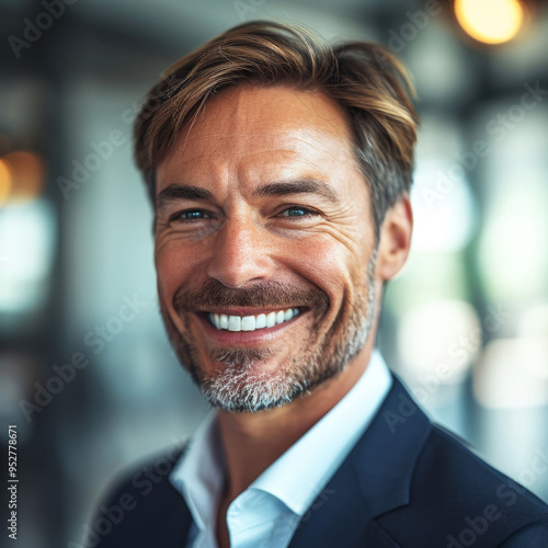 Confident mature Caucasian businessman in his 50s with short gray hair wearing a suit and tie against a neutral background