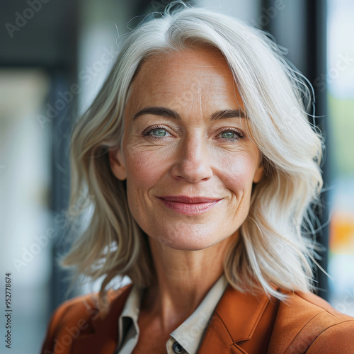 Confident mature Caucasian businessman in his 50s with short gray hair wearing a suit and tie against a neutral background