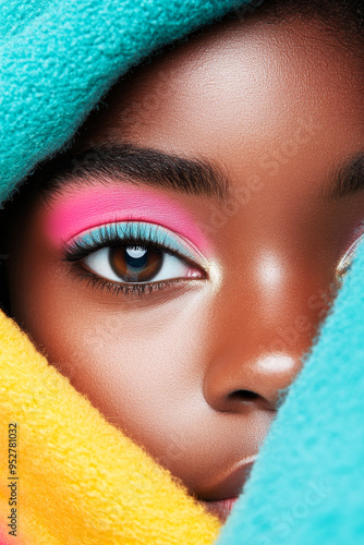 Close-up of young African-American woman with vibrant makeup and colorful fabric wrapping, exuding beauty and confidence in a studio portrait