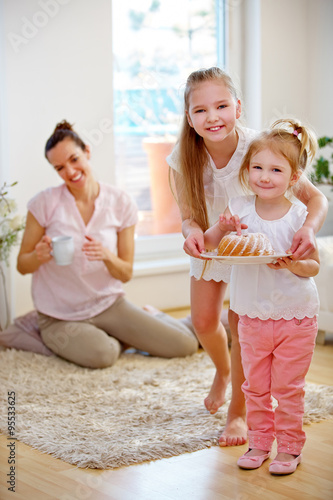 Familie mit Kuchen zu Hause im Wohnzimmer