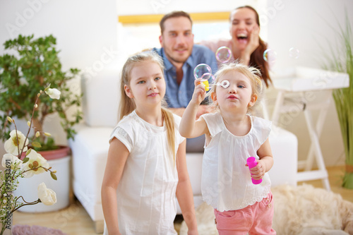 Familie mit Kuchen zu Hause im Wohnzimmer