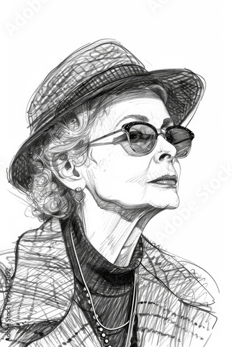 Pen drawing portrait of a senior woman wearing vintage fashion with hat and sunglasses