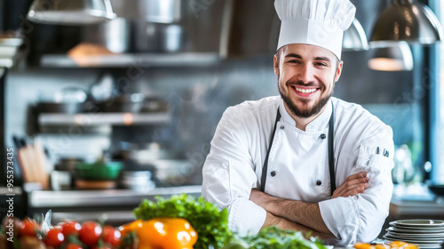 Professional chef in a commercial kitchen expertly presenting a gourmet dish