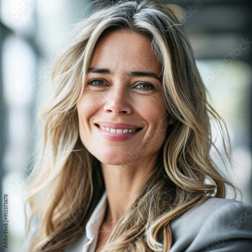 Smiling young businesswoman in casual office attire standing in a modern workspace