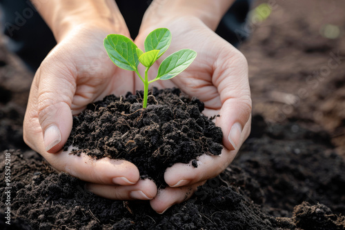 Hands nurturing a small plant in fertile soil, symbolizing care and growth