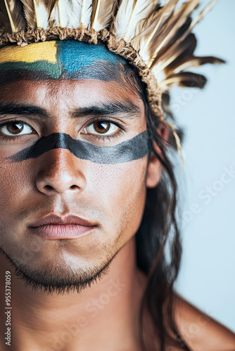 Close-up portrait of a young male with tribal face paint and feather headdress showcasing cultural heritage and intense expression in studio