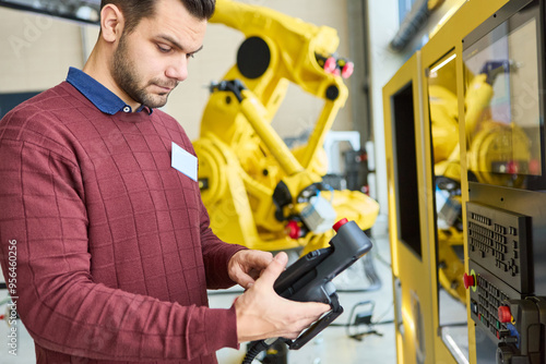 Engineer programming industrial robot with gripper arm in factory for automated production