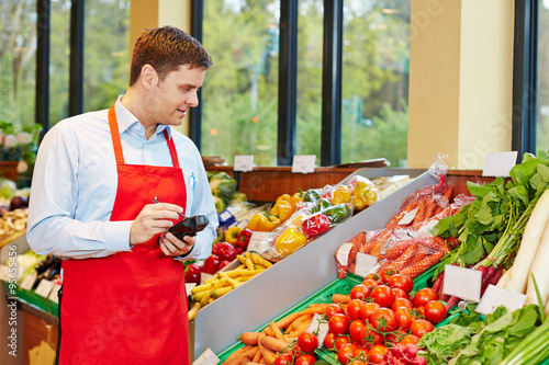 Marktleiter bestellt Gemüse mit Datenerfassungsgerät