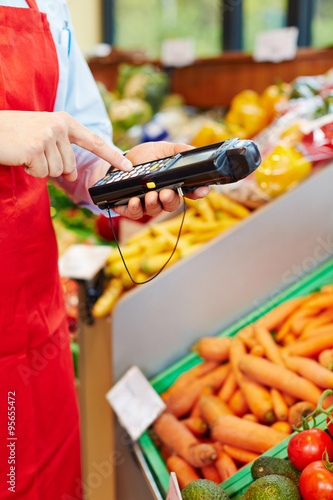 Marktleiter bestellt Gemüse mit Datenerfassungsgerät