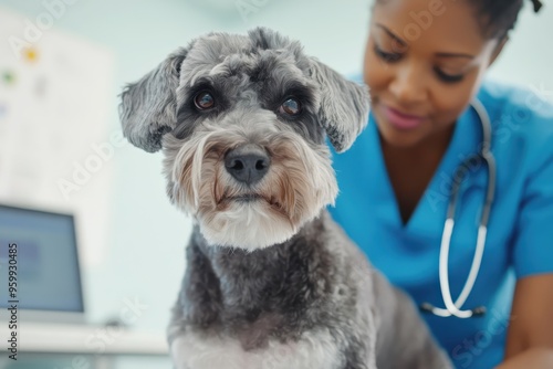 Smiling veterinarian holding cute dog in a modern pet clinic