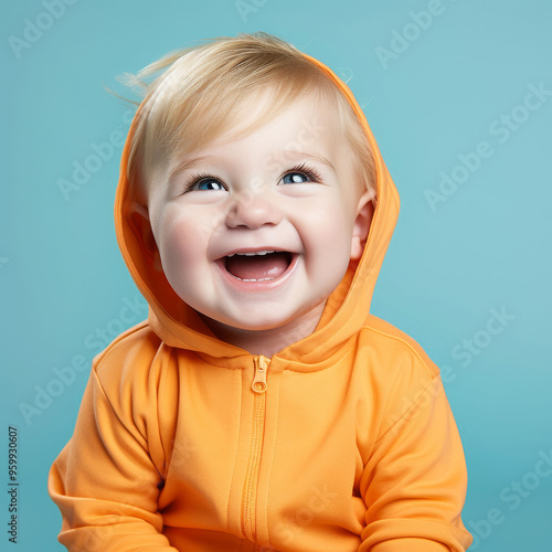 Joyful baby with blonde hair wearing an orange hoodie smiles happily