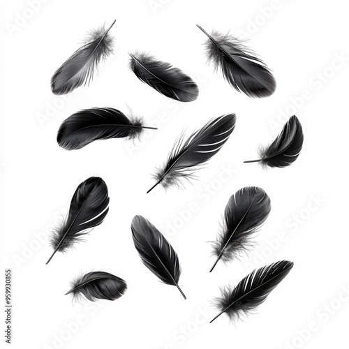 PNG set of artistic black feather illustrations in various creative silhouettes.