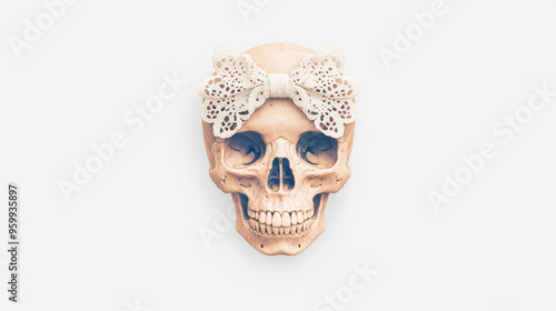 Gothic skull adorned with lace bow on white background
