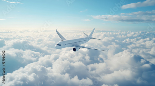 Commercial airliner soaring high amidst stunning cloudscape with dramatic sunlight